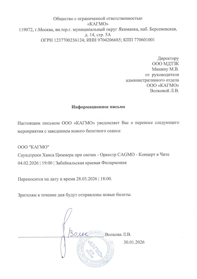 Уважаемый клиент! Спешим сообщить, что по информации, полученной от организатора, концерт оркестра «CAGMO» «Саундтреки Ханса Циммера при свечах», запланированный на 4 февраля 2026 года в 19:00 в Забайкальской филармонии, перенесён на 28 марта 2026 года, начало в 18:00. Новые билеты будут отправлены в течение дня по контактных данным, указанным при покупке. По всем дополнительным вопросам обращайтесь, пожалуйста, в службу поддержки CAGMO: https://help.cagmo.ru/ С уважением, команда поддержки Ticketland.