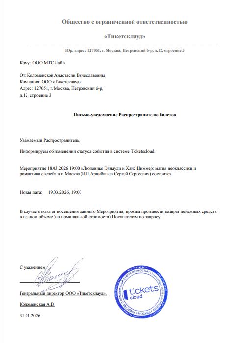 Уважаемый клиент! Спешим сообщить, что по информации, полученной от организатора, концерт «Людовико Эйнауди и Ханс Циммер: магия неоклассики и романтика свечей», запланированная на 18 марта 2026 года в 19:00 в Музее Пушкина, перенесен на 19 марта 2026 года, начало в 19:00. Ранее приобретенные билеты действительны на новую дату, обменивать их не нужно. Если вам не удобно посетить мероприятие в новую дату, вы можете вернуть билет по кнопке в личном кабинете во вкладке «Заказы». Деньги за электронные билеты вернутся автоматически в полном объёме на карту, с которой была произведена оплата. Если вы купили билет в кассе Ticketland.ru за наличный расчет, то обратитесь, пожалуйста, на почту: vozvrat@ticketland.ru. С уважением, команда поддержки Ticketland.