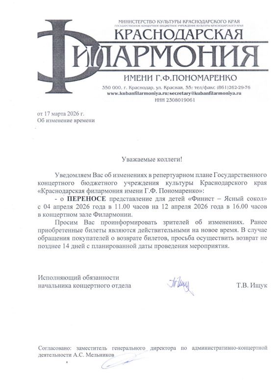 Уважаемый клиент! Спешим сообщить, что по информации, полученной от организатора, спектакль «Финист – ясный сокол», запланированный на 4 апреля 2026 года в 11:00 в филармонии имени Пономаренко, перенесен на 12 апреля 2026 года, начало в 16:00. Ранее приобретенные билеты действительны на новое время, обменивать их не нужно. Если вам не удобно посетить мероприятие в новое время, вы можете вернуть билет по кнопке в личном кабинете во вкладке «Заказы». Деньги за электронные билеты вернутся автоматически в полном объёме на карту, с которой была произведена оплата. Если вы купили билет в кассе Ticketland.ru за наличный расчет, то обратитесь, пожалуйста, на почту: vozvrat@ticketland.ru. С уважением, команда поддержки Ticketland.